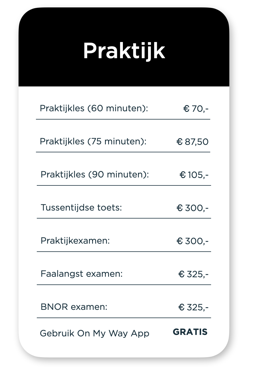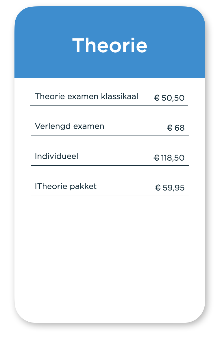 Onze tarieven zijn inclusief 21% btw en het 0% tarief voor de examens.